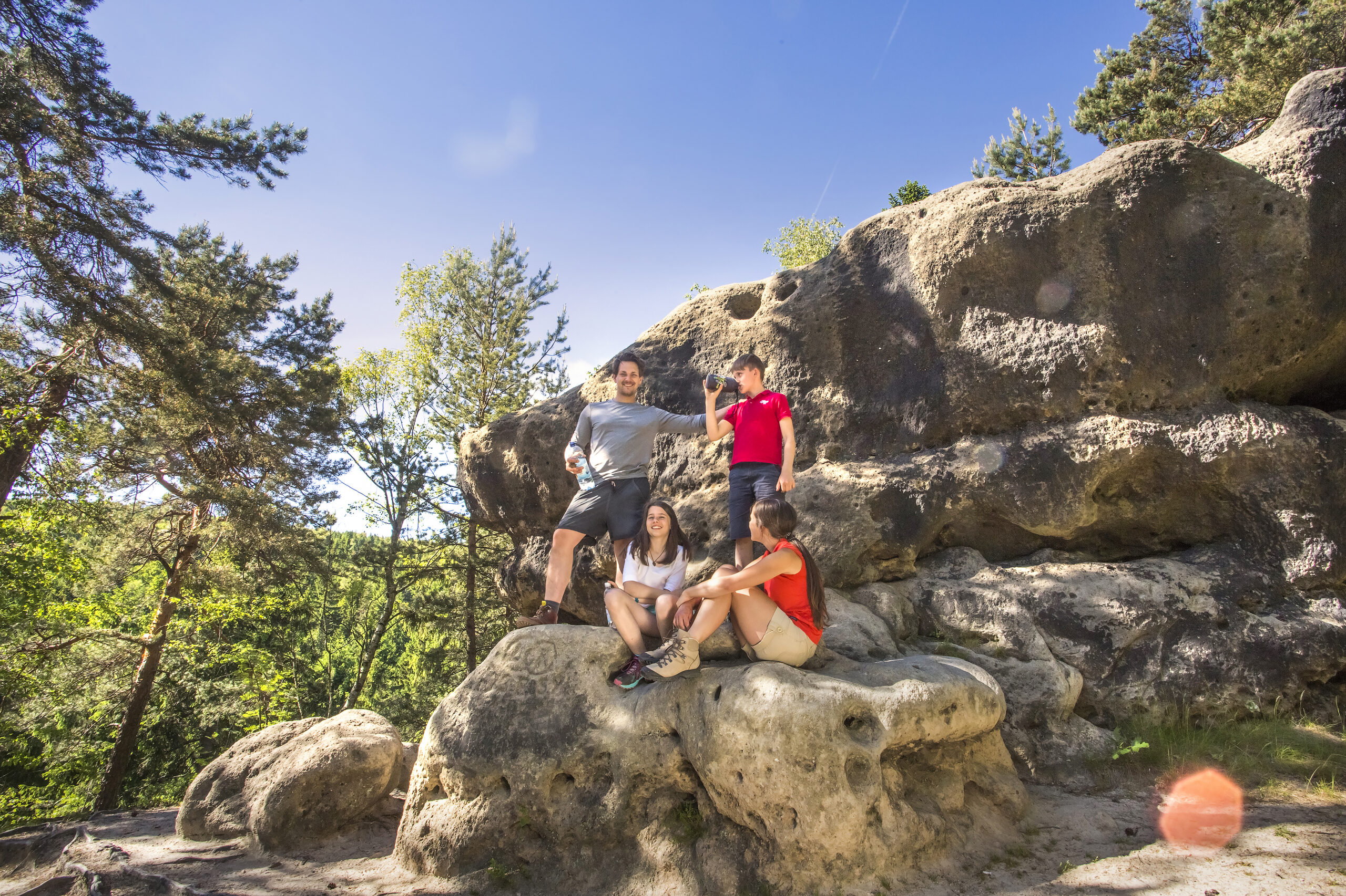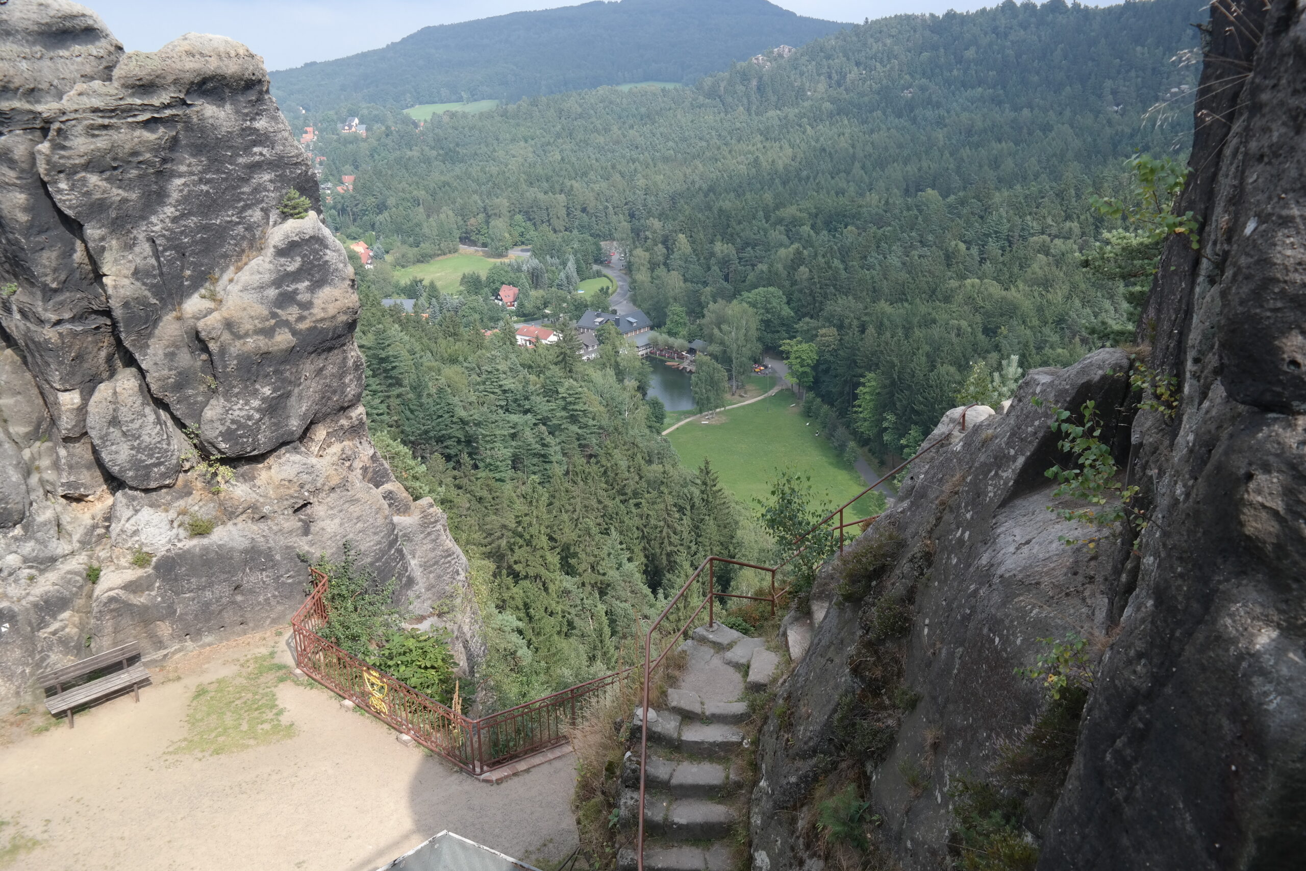 Start: Großer Parkplatz Jonsdorf- an der Gondelfahrt. An der Schwarzwasserquelle nochmal die Trinkflasche füllen – das Eisen macht’s Wasser nicht schön, aber es schmeckt! Kurz darauf der Gondelteich mit Gaststätte, Hotel, Eisdiele und Spielplatz – und klasse Nonnenfelsen-Blick. Ums Areal herum geht’s treppauf in die Zigeunerstuben auf schmalem Waldweg zum Nonnenfelsen – und zu einer bewirtschafteten Bergbaude. Mit den Nonnenfelsen hinter dir rückt Tschechien näher. Am Schlagbaum links ab: Entlang der Grenze steigst du 620 m hoch auf den Plissenberg-Sattel, inklusive Ausblick ins tschechische Lausitzer Bergland! Über den Laubhübelweg kommst du am Kletterfelsen Rehstein vorbei zum Kroatzbeerwinkel, kurz und steil der Anstieg zum alten Sportplatz, links mächtige Felswände. Jetzt geht’s in die Jonsdorfer Mühlsteinbrüche; steile Stufen führen zum Sandsteinbruch-Eingang Bärloch. Hier beeindruckt die durch Felssturz entstandene Mausefalle, wo ein kleiner einen mächtigen Block stützt.